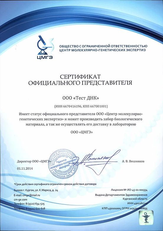 Экспертиза (тест) ДНК с юридической силой проводится для установления отцовства, материнства или другой степени родства в досудебном порядке, процедура отличается от судебной тем, что судебная медицинская генетическая экспертиза проводится по определению суда, данная же экспертиза позволяет использовать заключение и соответствующий комплект в суде и органах опеки.